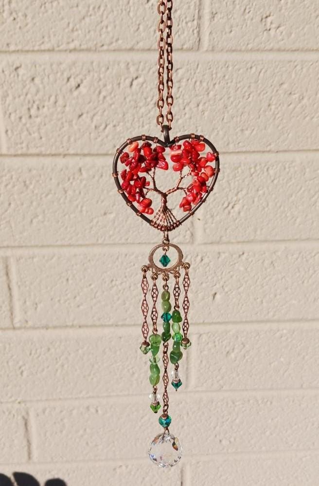 Tree of Life pendant is copper with red coral chips, copper accents, jade and emerald crystals with a 20mm prism that shows off all the dazzling rays!